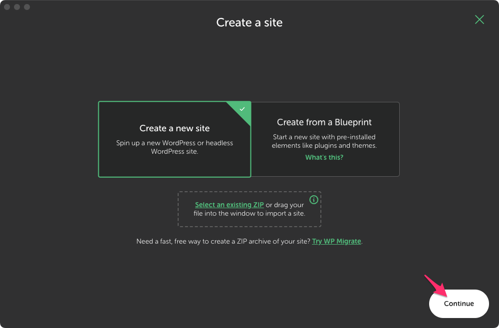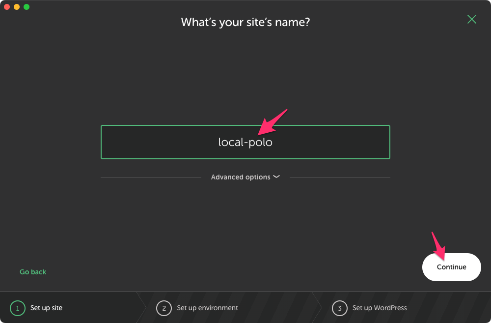 サイト名の入力画面が表示されので、好きな名前を入力して、「Continue」ボタンをクリック。