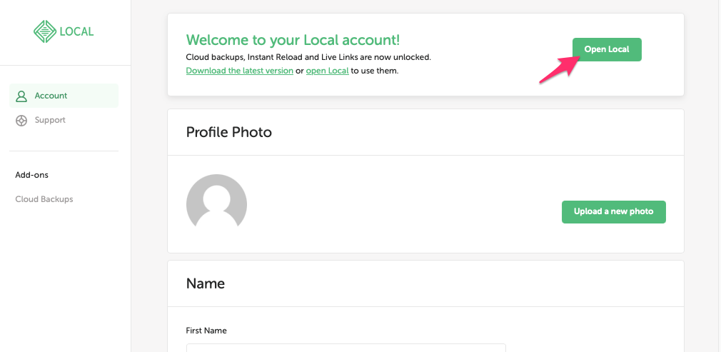 アカウント画面右上の「Open Local」ボタンをクリックすると、Localアプリに戻ります。ブラウザは開いたままなので、不要であれば閉じます。