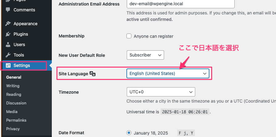 Settingから入り、Site Languageで日本語を選択。下の方に「Save Changes」をクリックして保存。
