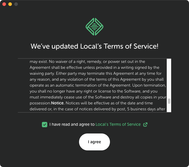 Localアカウントの作成と、利用規約の同意が必要。まず利用規約にチェックを入れ、「I agree」ボタンをクリック。